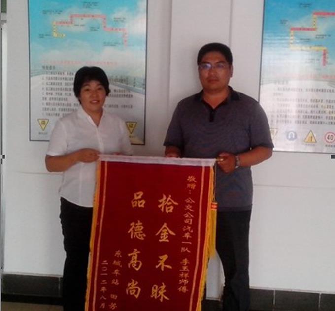 2012年8月2,長(zhǎng)途總站東城車(chē)站職工田芳女士拿著一面寫(xiě)有“拾金不昧、品德高尚”的錦旗來(lái)到市公交公司汽車(chē)一隊(duì),感謝車(chē)隊(duì)李玉祥師傅拾金不昧的高尚品德。