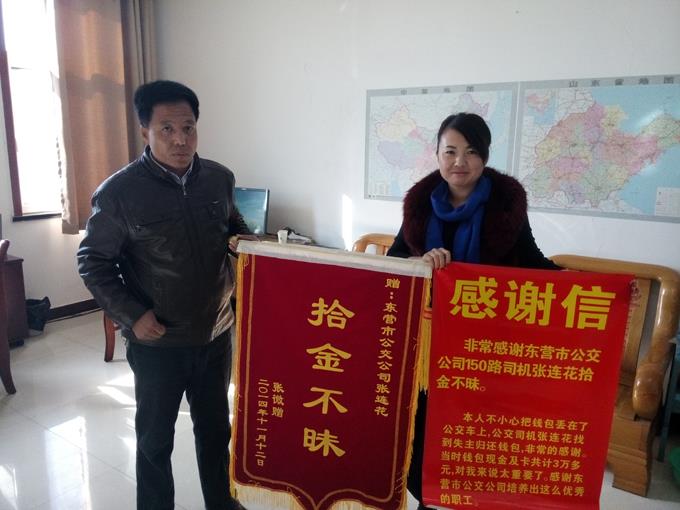 2014年11月12日,家住東營(yíng)區(qū)錦繡龍軒小區(qū)的張微來(lái)到市公交公司汽車(chē)四隊(duì),送來(lái)一面寫(xiě)有“拾金不昧”的錦旗和感謝信,感謝車(chē)隊(duì)駕駛員張連花拾金不昧的高尚品德。
