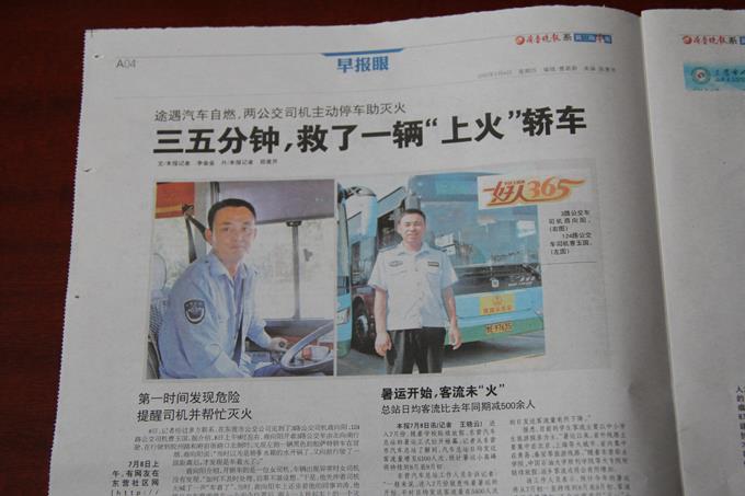 伸出援手的是公交公司3路車駕駛員商向陽(yáng)和124路車駕駛員曹玉國(guó),兩人齊表示,只是恰好路過看到伸出援手而已,都是應(yīng)該做的。商向陽(yáng)介紹:“自燃轎車的司機(jī)是女性,當(dāng)時(shí)她都沒有發(fā)現(xiàn)引擎蓋冒濃煙,公交車底盤高,我一扭頭就看到了,當(dāng)時(shí)事發(fā)鬧市區(qū),萬(wàn)一燃燒起來(lái)引發(fā)爆炸之類的就太危險(xiǎn)了,于是我把公交車靠路邊停下,拎著滅火器就下來(lái)幫忙了?!辈苡駠?guó)當(dāng)時(shí)駕駛著124路公交車看到這一幕,也緊跟著拎著滅火器下車幫忙?;饟錅绾螅瑑晌凰緳C(jī)便回到公交車上開車離開了。
