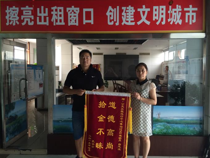 7月24日乘客孔女士乘坐魯ET2742出租車從燕山路到東城銀座,下車時不慎將10輛勝利油田貨運機動車登記證書及其他手續(xù)遺落在出租車上,因下車時孔女士未要出租車乘車票據,無法聯(lián)系該出租車駕駛員。 出租車駕駛員曲志波發(fā)現遺失物品后立即送到市公交公司出租運營中心,在運營中心的幫助下聯(lián)系上了孔女士,將遺失在出租車上的物品如數歸還,乘客為了表示對出租車駕駛員的感謝,于7月27日委托其丈夫送來錦旗一面。