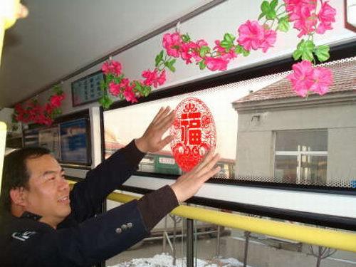元月11日春運(yùn)第一天,公交公司8路車組工作人員忙著將自費(fèi)購買的彩色拉花、剪紙等飾品,張貼、懸掛在車廂內(nèi),積極營造出春運(yùn)溫馨和諧的喜慶氣氛,與乘客一起喜迎春節(jié)的到來。