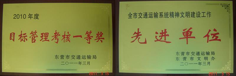 2011年3月11日,在全市交通運(yùn)輸系統(tǒng)工作會(huì)議上,市公交公司被市交通運(yùn)輸局授予“2010年度目標(biāo)管理考核一等獎(jiǎng)”、“全市交通運(yùn)輸系統(tǒng)精神文明工作先進(jìn)單位”。